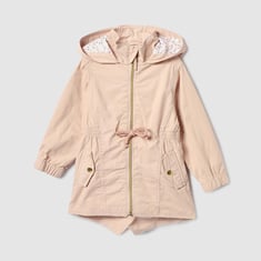 Layer her up for winter in style in this longline jacket. It has a hooded neck, full sleeves with elasticated cuffs, and a zip front. The elasticated waist with drawstring closure, waist snap pockets, and a slit at the back hem enhance the functionality and style.