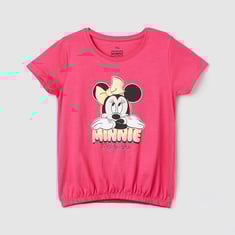 Brighten her day with this T-shirt. A perfect casual wear option, it is highlighted with Minnie Mouse graphics on the front, a round neck, short sleeves, and an elasticated hem.