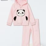 This Panda trousers set features solid bottoms with an elasticated waist, drawstring, and side pockets, paired with a hoodie sweatshirt adorned with fuzzy panda detailing, a zip closure, and ribbed hems for cozy, playful style.