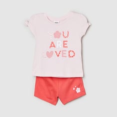 Perfect for wearing day or night, this sleepwear set is highlighted with graphic prints. It includes a T-shirt with a round neck and short sleeves with a bow detail. This pair of shorts features a ribbed waist with drawstring closure and convenient pockets.