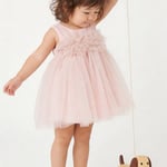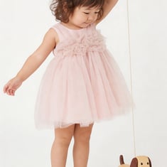 Sparkling and chic, this ruffles dress features a round neckline, sleeveless design, and a zip closure. Adorned with sparkles all over, it combines playful ruffle detailing with a glamorous finish, making it perfect for parties and special occasions.