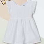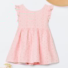 This Schiffili dress combines elegance and comfort with its round neck, no sleeves, and button closure. The delicate Schiffili embroidery adds a feminine touch, while the flared hem creates a flattering, flowy silhouette.