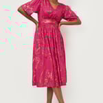 Elevate your ethnic collection with this stunning foil printed fit and flare dress. Featuring a graceful V-neckline and elegant half sleeves, this midi-length dress combines traditional charm with a modern twist. The foil print adds a touch of sophistication, making it perfect for festive occasions.