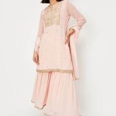 Dress up for occasions in this ethnic set. It includes a straight kurta with a notched neck, sequined embroidery at the yoke, and three-quarter sleeves. The pair of sharara pants has an elasticated waist and gota patti border. The dupatta with the border completes the look.