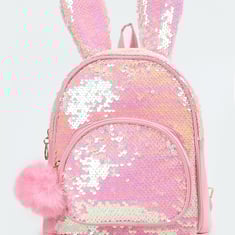Add a playful twist to your look with this sequin bunny backpack. Featuring fun bunny ears, it has one main compartment for your essentials and a front zippered pocket for extra storage. The adjustable back straps ensure a comfortable fit, while the pom-pom charm adds a cute touch, making it perfect for casual outings.