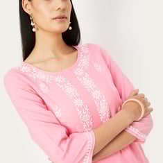 Flaunt a look of elegance in this kurti, It is with an embroidered design, a round neck, three-quarter sleeves, and a short length.