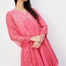 A wardrobe essential, this ethnic set is updated with embroidery. It includes a flared kurta with a V-neck and three-quarter sleeves. Complemented by a pair of printed sharara pants with an elasticated waist and a dupatta, this set effortlessly blends traditional charm with contemporary style.
