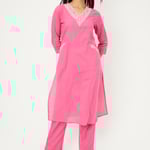 Add a touch of elegance to your everyday style with this embroidered straight kurta set. The kurta features yoke embroidery, a flattering V-neck, 3/4th sleeves, side slits, and a handy side pocket. It's paired with straight pants that have an elasticated waist for all-day comfort.