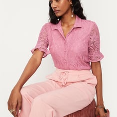 An epitome of elegance, this shirt is highlighted with a floral lace overlay. It is designed with a spread collar, short sleeves with ruffled cuffs, and a button-down front. Style this shirt with a pair of trousers and block heels for a sophisticated look.