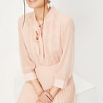 Flaunt your elegance in this midi dress. It has a tie-up neck, three-quarter sleeves, and lace insets at the yoke. The pleated skirt lends a flowy, breezy look. Style this dress with strappy heels for an elevated look.