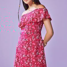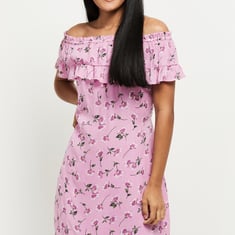 A printed Bardot dress that has short sleeves and off-shoulder neck is the right option for a casual weekend.