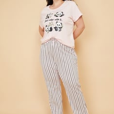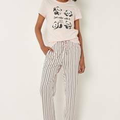 This printed PJ set features a round neck T-shirt with half sleeves, adding a cheerful touch to everyday lounging. The striped bottoms come with an elasticated waist, offering easy comfort and a relaxed fit for unwinding. Model Size :