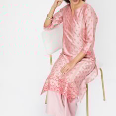Embrace elegance with this kurta set. The beautifully printed straight-cut kurta features a notched neck, adding a touch of sophistication to its classic design. A convenient waist pocket enhances both style and functionality. Paired with palazzos that have an elasticated waist, this set ensures comfort and a flattering fit, making it a standout choice for any occasion.