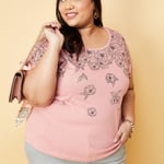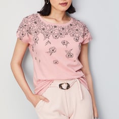 Add an elegant twist to your casual wardrobe with this t-shirt. It is highlighted with floral graphic prints, a round neck, and short sleeves. Style this tee with trousers and block heels.