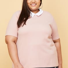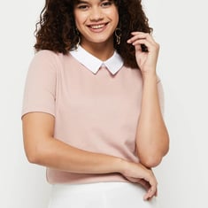 Bring a preppy touch to your outfit with this top featuring a contrast collared neckline and short sleeves. Team up this top with jeans, stilettos and a clutch for a fashion-forward look.