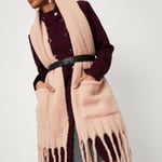 Slay through the season by styling your outfit with this muffler. This plush design with fringe hem and convenient pockets keep you warm and cosy. Style this muffler over a winter coat and dress and complete the look with boots.