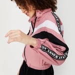 Layer up this striped jacket during chilly days and make a statement. It features a stand collar and draw cord hemline.