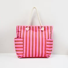 Designed with a striped surface, this tote bag features a spacious inner compartment and zip closure.
