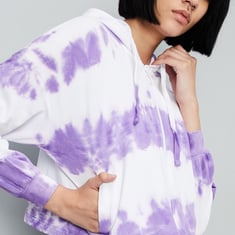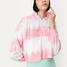 Layer up your activity or casual outfit with this sweatshirt. It features a tie and dye pattern, hooded neck, zip-through front, long sleeves, and waist pockets. Team up this jacket with a top, tights, and slip-on sneakers to ace the look.