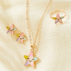Make your little girl dazzle with this star-shaped jewellery set. It comes with a necklace, a pair of studs, and a ring that is colourblocked.