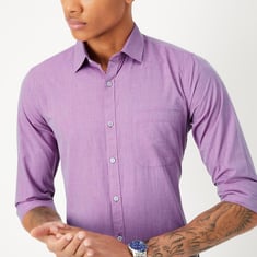Add a stylish touch to your formal wardrobe with this solid shirt. Featuring a spread collar, full sleeves, a button placket, and a curved hemline, it's the perfect choice for a handsome and laid-back look.
