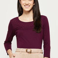 Upgrade your wardrobe with this knit t-shirt featuring a textured, embroidered yoke, round neckline, and three-quarter sleeves.