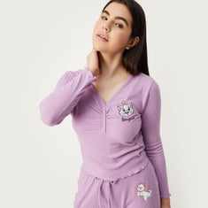 Cozy comfort meets cute Marie the Cat prints in this nightwear set. It includes a V-neck, full sleeves, and lettuce trim. The pair of pyjamas feature a drawstring waist and a full-length profile.
