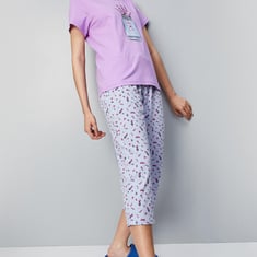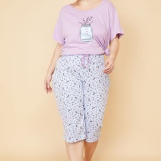 Enjoy a restful slumber in this sleep set. It features a T-shirt with a round neckline, short sleeves, and a graphic print on the chest. This tee is contrasted with a pair of capris featuring floral prints and a drawstring waist.