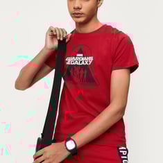Add his favourite superhero to his everyday collection with this T-shirt. Highlighted with Guardians of the Galaxy graphics on the chest, this T-shirt features a crew neck, short sleeves, and Marvel taping on the shoulders. Pair this tee with matching track pants and sneakers for a sporty look.