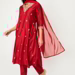 Embrace timeless style with this embroidered A-line kurta set. The kurta features a flattering V-neck, 3/4th sleeves, and a practical side pocket, paired with straight pants featuring an elasticated waist and a matching dupatta for a coordinated finish.