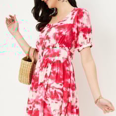 A lovely addition to your weekend wardrobe, this dress is updated with a vibrant tie & dye pattern, it features a square neckline, puffed sleeves, and a midi length.