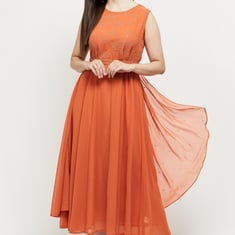 Make your ethnic collection look trendy and chic with this maxi dress. It is designed with a round neckline, sleeveless construction, and an embellished surface. The product comes with additional sleeves. It can be teamed up with a pair of heels and accessories to give it a glamorous effect.