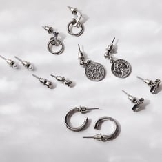 Make your outfit dazzle with this earring set. It has assorted designs and a post and back closure. It consists of studs, hoops, and drop earrings.