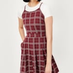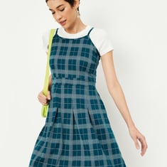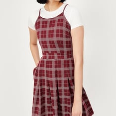 Induce comfort and style with this checked pinafore dress accentuated with a round neckline, spaghetti straps, box pleats, pockets and a solid under-layering t-shirt with a round neckline and short sleeves.