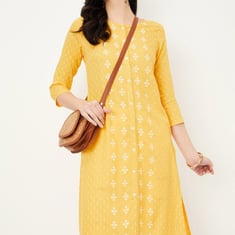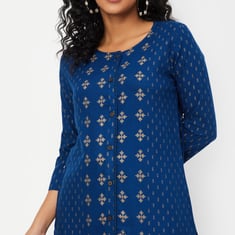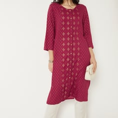 Flaunt a look of elegance in this foil-printed straight kurta. It features a round neck, three-quarter sleeves, lace, and buttons at the front.