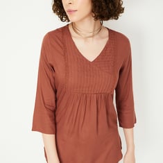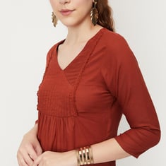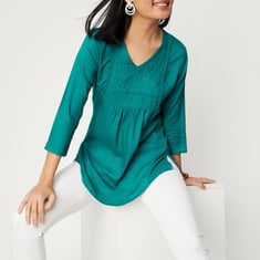 A wardrobe must-have, this kurti is tailored in an A-line profile. It features a pintuck yoke with lace trim, a V-neck, three-quarter sleeves, side slits, and a curved hem.