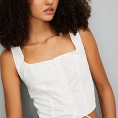 This corset top features a flattering square neck and a sleeveless, cropped design. The intricate Schiffli embroidery adds a touch of elegance and detail, making it a perfect statement piece.