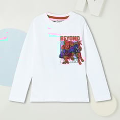 Add a fun twist to your kid's casual wardrobe with this vibrant T-shirt. Styled with a cool Spiderman print on the front and back, it features a classic crew neck and full sleeves, making it a playful choice for everyday adventures.