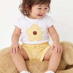 Fresh and feminine, this short set features a T-shirt adorned with delicate floral applique, styled with a round neck and half sleeves for everyday comfort. It is paired with matching shorts designed with a drawstring closure and practical pockets, blending charm with functionality.