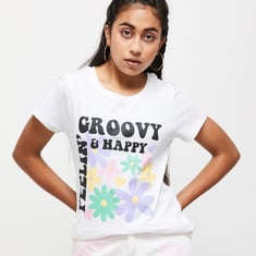 Update her wardrobe with this T-shirt featuring a vibrant graphic print, a round neckline, and short sleeves.