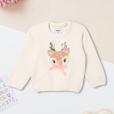 Add a festive touch to your winter wardrobe with this cozy sweater featuring a classic round neck, full sleeves, and a charming reindeer appliqué design.