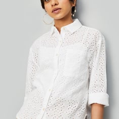 She'll be the epitome of elegance in this shirt. It has schiffli embroidery for an elevated look. This shirt has a spread collar, a patch pocket on the chest, full sleeves with buttoned cuffs, and a curved hem.