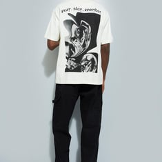Stay on-trend with this t-shirt featuring a graphic print at the back and a placement print on the front. Designed with a crew neck, short sleeves, and an oversized profile, this tee effortlessly elevates your weekend look.