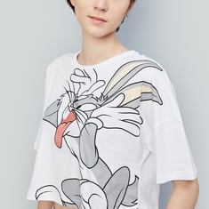 Bring some fun to your wardrobe with this Bugs Bunny printed crop t-shirt! Featuring a playful graphic of everyone's favorite cartoon character, it has a crew neck and half sleeves for a classic fit, with drop shoulder sleeves for an added relaxed vibe.