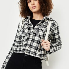 Elevate your fashion game with this checked jacket. Featuring a cropped silhouette, hooded neck, full sleeves, two flap pockets, and buttoned cuffs, it adds a stylish touch to any outfit.