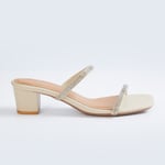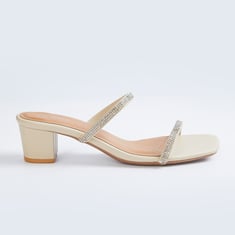 Add a touch of glamour to your look with these embellished block heels. Featuring a dual strap design, they provide both style and comfort with a slip-on fit. Perfect for elevating any outfit, from casual to dressy occasions.