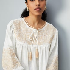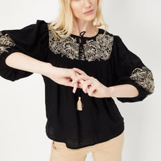 Empower your essence with this embroidered top in your collection featuring a tie-up neck with tassels, three-quarter puffed sleeves in regular length.
