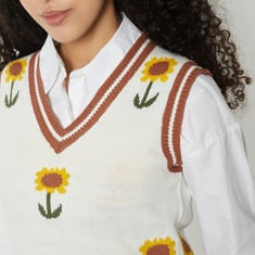 A charming knit sweater vest featuring a floral pattern, a classic V-neckline, a sleeveless cut, and a cropped silhouette for a trendy layered look.
