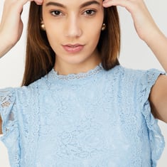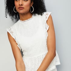 Paint a picture of elegance in this top featuring a lace overlay. It is fashioned with a mock neck, peplum hem, and ruffled sleeves.