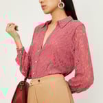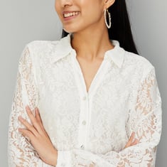 Look dainty and elegant in this blouse. It features a delicate lace overlay, spread collar, full sleeves, and a front pearl button placket for added style. Style this blouse with wide-leg trousers and pumps for an elevated 9 to 5 look.